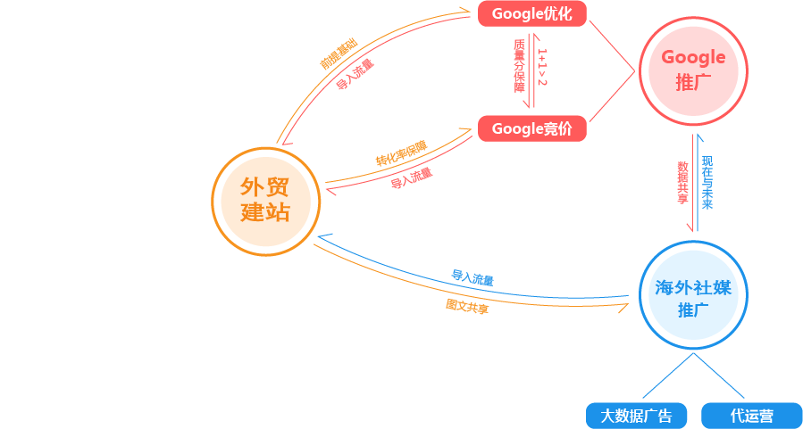 郑州外贸推广公司为您提供全面的“整合”方案,为您的企业提供全生命周期的精细化服务和咨询。为此,我们搭建了从广告投放到SEO优化,从内容运营到网站开发,从品牌策划到电商运营的近100人的团队,组成了一家集全球渠道资源、人才资源、技术资源为一体的数字营销机构,为您一站式解决出海难题,实现品牌全球推广!